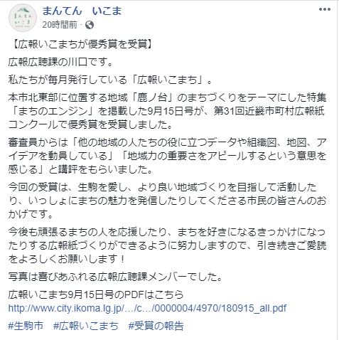 「広報いこまち」我が街の特集号がコンクール優秀賞