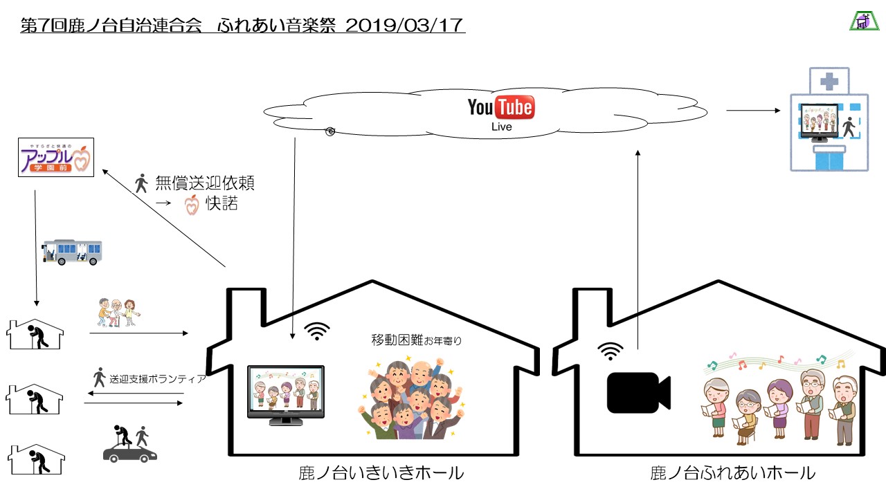 移動に困難な高齢者を近くの施設であるいきいきホールまでボランティアメンバーで送迎し、音楽祭をみんなでお茶でも飲みながらライブ中継で楽しんでもらおう!というもの。