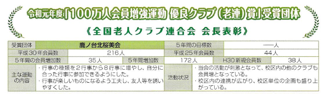 鹿ノ台老人クラブ北桜美会、3年連続で全国「100万人会員増強運動優良クラブ(老連)賞」を受賞。