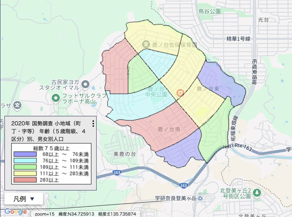 ②集計地域:小地域(町丁・字等)→統計名:国勢調査→年または年月:2020年→統計表(表題):年齢(5歳階級、4区分)別、男女別人口→指標/データ:総数75歳以上 等→「指標選択」