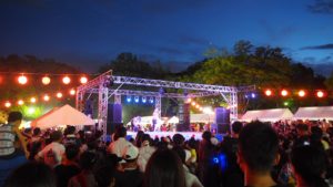 このあとは、二日間とも飛び入り歓迎、盆踊り!従来の音頭のみならず流行りのポップスもあり、ステキな振り付けにあわせ舞台の上下関係なく、輪になっての饗宴が、夜遅くまで繰り広げられました。